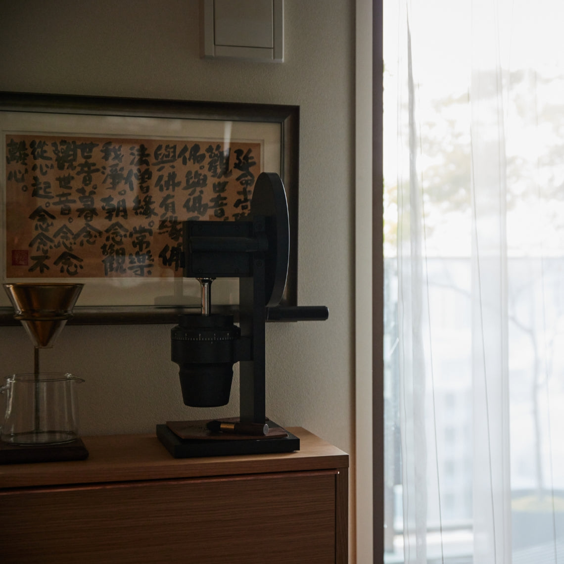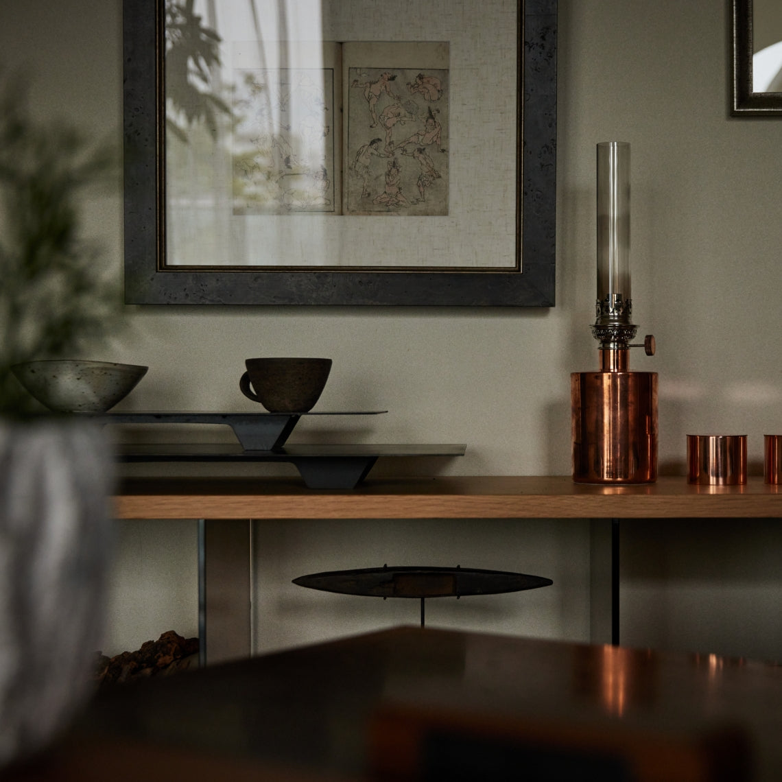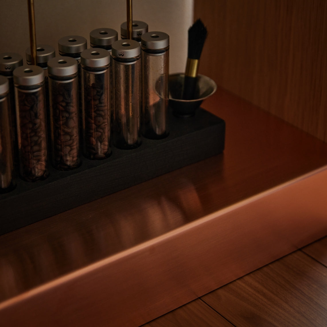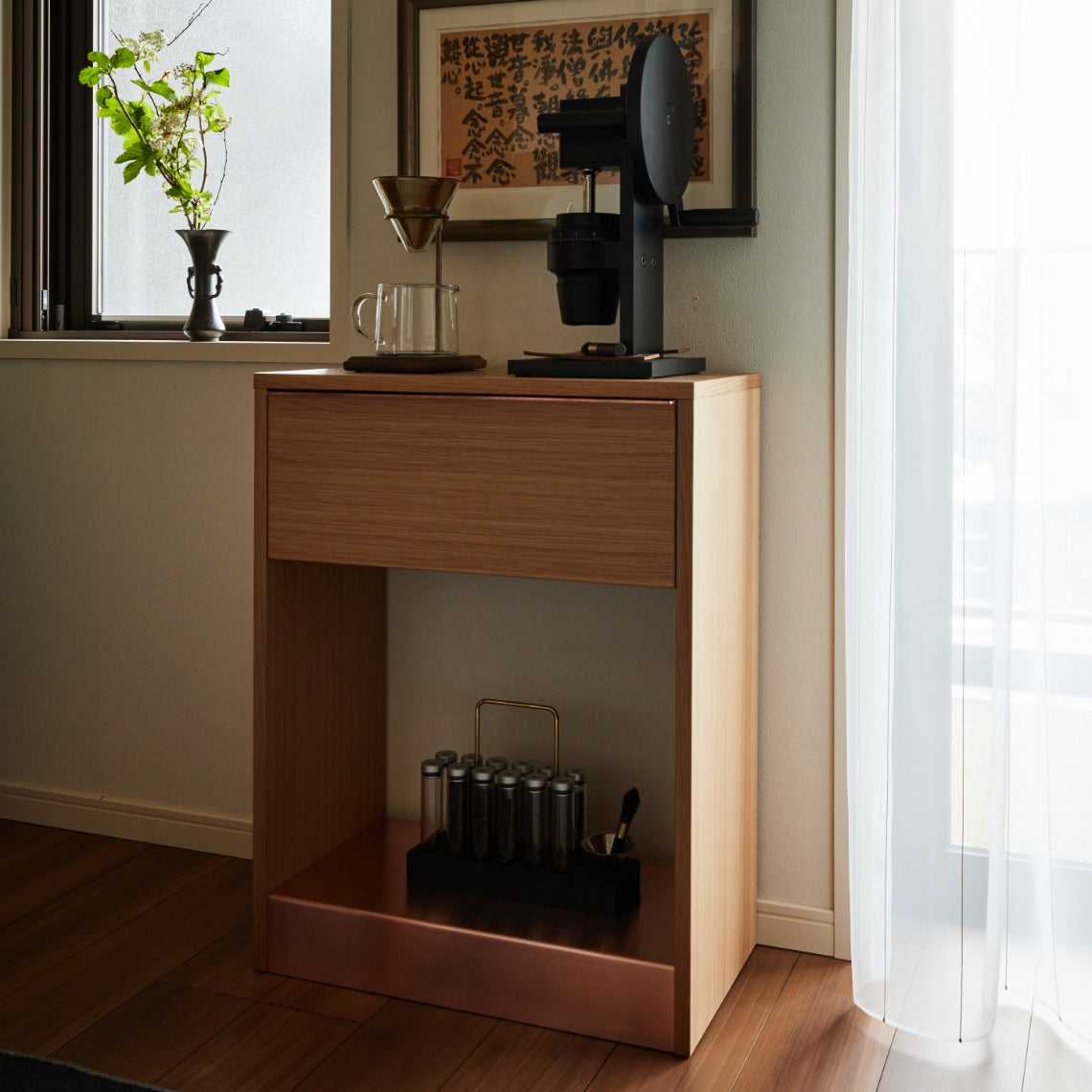 もう一つは、ミルを置き、そこでコーヒーを淹れるためのコーヒーシェルフ。こちらはオーク材と銅を合わせました。「この部屋に元からあった、銅のランプとディフューザーにインスパイアされました。銅というのは最初は赤くてピカピカした美しさですが、時間が経過するとともに、手と馴染んで渋みを増します。デスクのニヤトーとともに、時を刻む素材です」と坂下さんはその意図を説明します。
