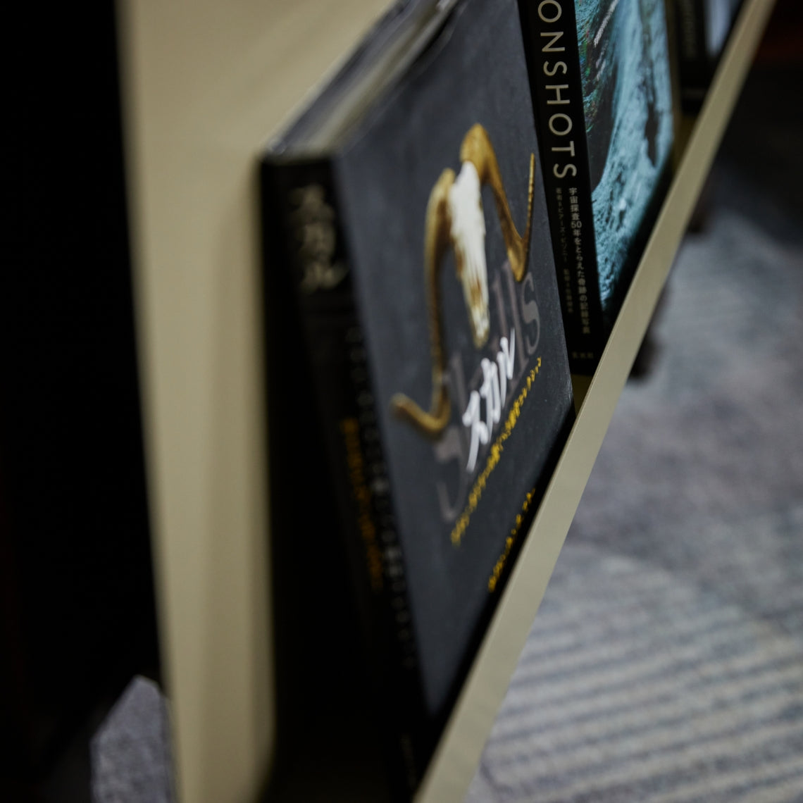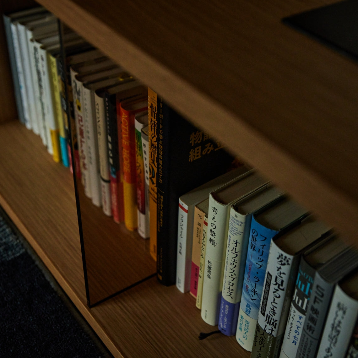 坂下さんは、他にも部屋に置くシェルフを2つデザインしました。一つは、オーク材を使い、ブラウンのガラスで間仕切りをしたブックシェルフ。一見シンプルな形に見えますが、一つひとつのスペースが確保されつつ隣のスペースとゆるくつながるデザインは、置かれたものが意味を持って緩くつながり合うこの空間にピッタリです。