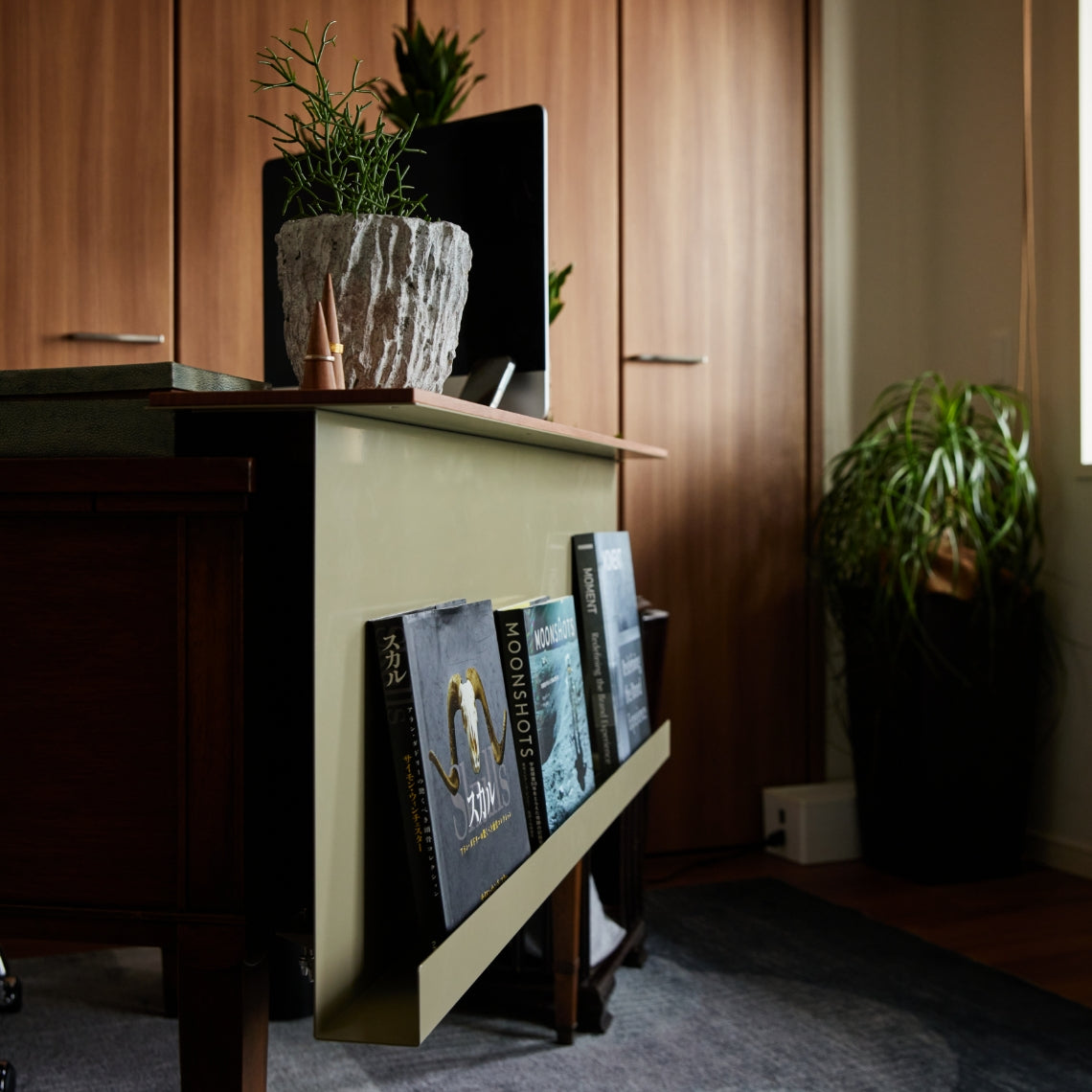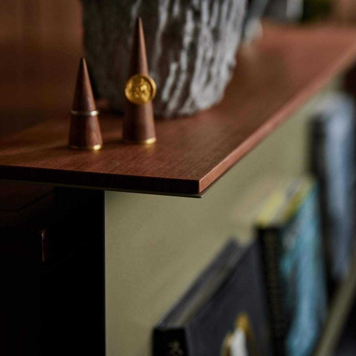 できあがったデスクシェルフは、金属の上にさらに天板をあしらったものになりました。素材は、強度と加工のしやすさ、質感の観点からスチールが選ばれました。そして木はニヤトーを使用。最近はあまり使われなくなりましたが、時間の経過とともに深みを増すおもしろい素材で、“一つの空間で時間の流れを表現する”というコンセプトにピッタリです。