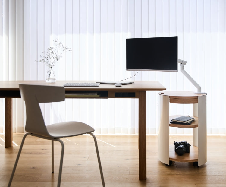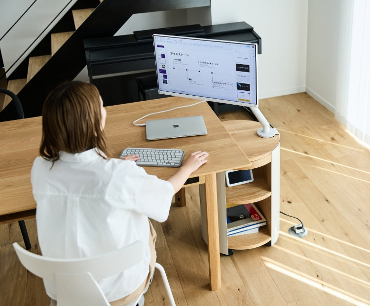 ワゴンにモニターアームを取り付けられるため、ダイニングテーブルはすっきり広々。
