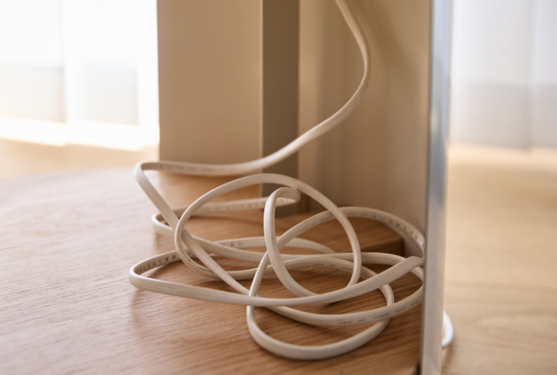 WAAKwagon COLUMNにコンセントタップを取り付ける場合も、大もとの電源は必要です。足元からしっぽのようにケーブルを通せるので、壁や床のコンセントまで最短距離で配線できます。
