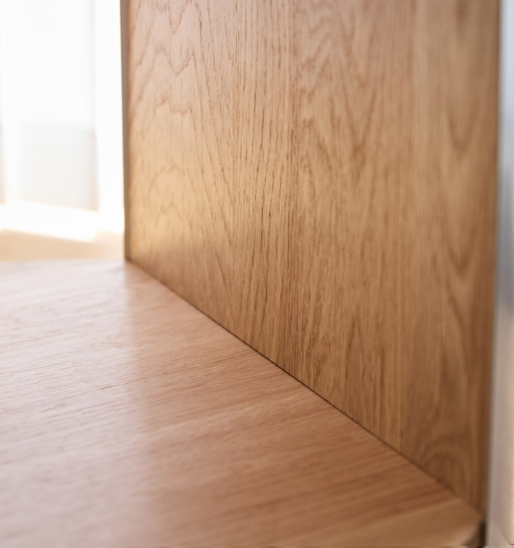 オーク無垢材とグレージュ色のボディの組み合わせによる流麗なフォルムは、モダンインテリアの家具や空間に調和します。