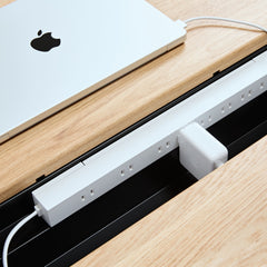 天板後部の固定天板と、手前のスライド天板の間には配線用のスリットを実装。天板を閉じた状態でも必要なケーブルのみ机上に出せるため、充電や外部モニターへ接続するケーブルもすっきりと整えられます。